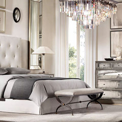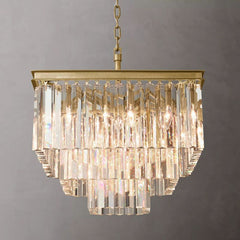 | Inspired by the Art Deco style of 1920s Paris, the collection captures the period's fascination with geometric forms. Masterfully refracting the light, hundreds of faceted, dynamic prisms evoke the allure of the era. Hanging like lush fringe from a welded iron frame, the angular glass juxtaposes elegance and industrialism. |