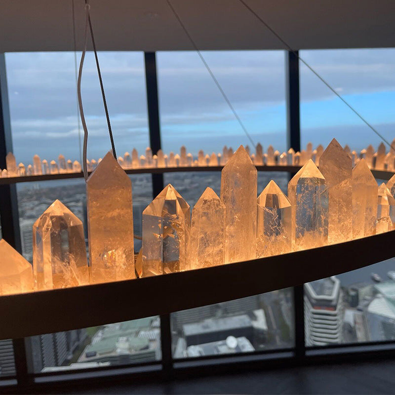 This modern quartz crystal chandelier is a magnificent piece that elevates the aesthetics of any modern living space. The pendant light features an up or down-facing quartz crystal held in a sleek brass frame. The brushed brass metal finish of the frame complements the quartz crystal's natural form and adds an element of sophistication to the overall design. The adjustable suspension wire height makes it adaptable to varying ceiling heights, and customizable sizes make it suitable for rooms of all sizes.