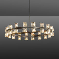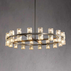 Inspired by the intricate design of industrial gears, our chandelier collection combines the rhythmic interlacing of hexagonal spokes with a circular crystal glass interior. The elegant fusion of these elements creates a stunning visual effect, with light shining through the glass reminiscent of a flickering candle. Crafted from solid brass, this chandelier embodies both strength and sophistication.
