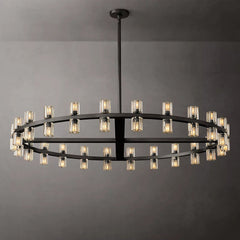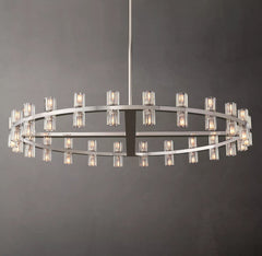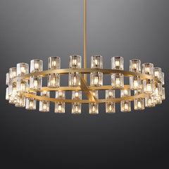The rhythmic design of our chandelier collection draws inspiration from the intricate shape and scale of industrial gears. Hexagonal spokes interlace with negative space, creating a captivating interlocking pattern. The crystal glass interior, hexagonal in form, contrasts with a simple yet sturdy metal frame, allowing light to shine through like a flickering candle.
