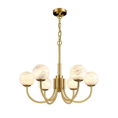 | Alabaster Modern Brass Chandelier boasts a galactic appearance, becoming a radiant focal point in your space. The alabaster shade, with its pearl-like quality, can be combined in various quantities, creating a pure and eye-catching aesthetic |