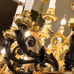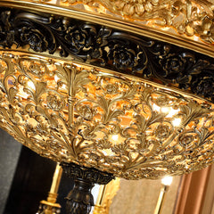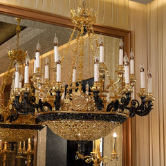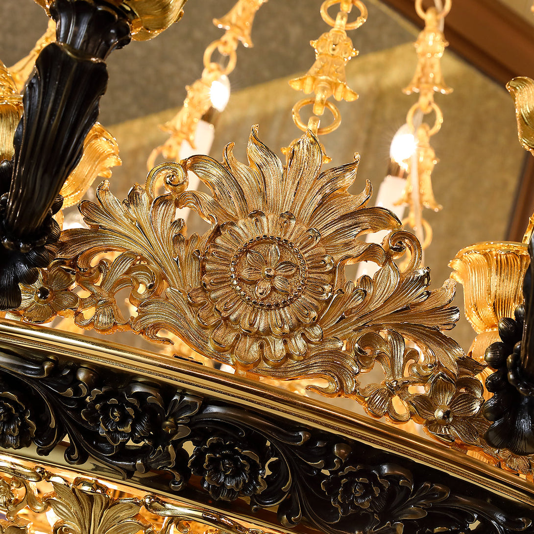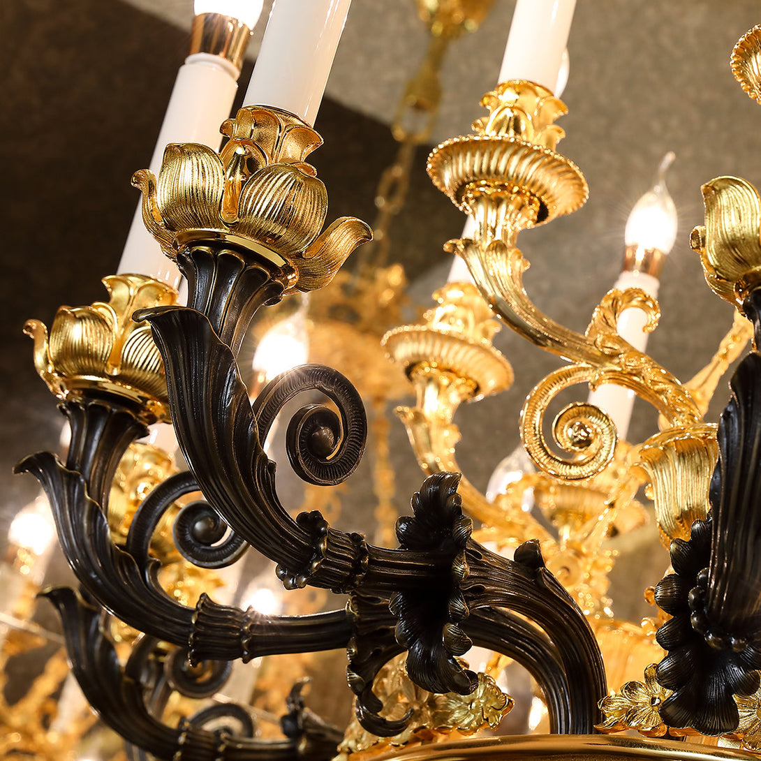 American Classic design Bronze chandelier--This lamp has 25 lamp heads, forming an amazing chandelier design. The lamp body is made of selected high-quality copper material; a professional dewaxing process; the bronze lamp arm line is beautiful and smooth; the copper hollow base is exquisite and elegant. An interpretation of American classical art atmosphere. We are dedicated to offering first-class workmanship and conveying unique and distinct artistic tastes and pursuits. Every collection of Jade adheres to the principles of rigor and strictness leading to high quality. This piece is, without doubt, no exception.