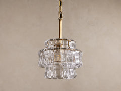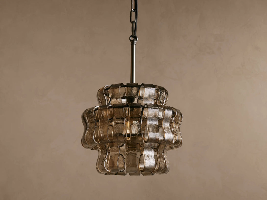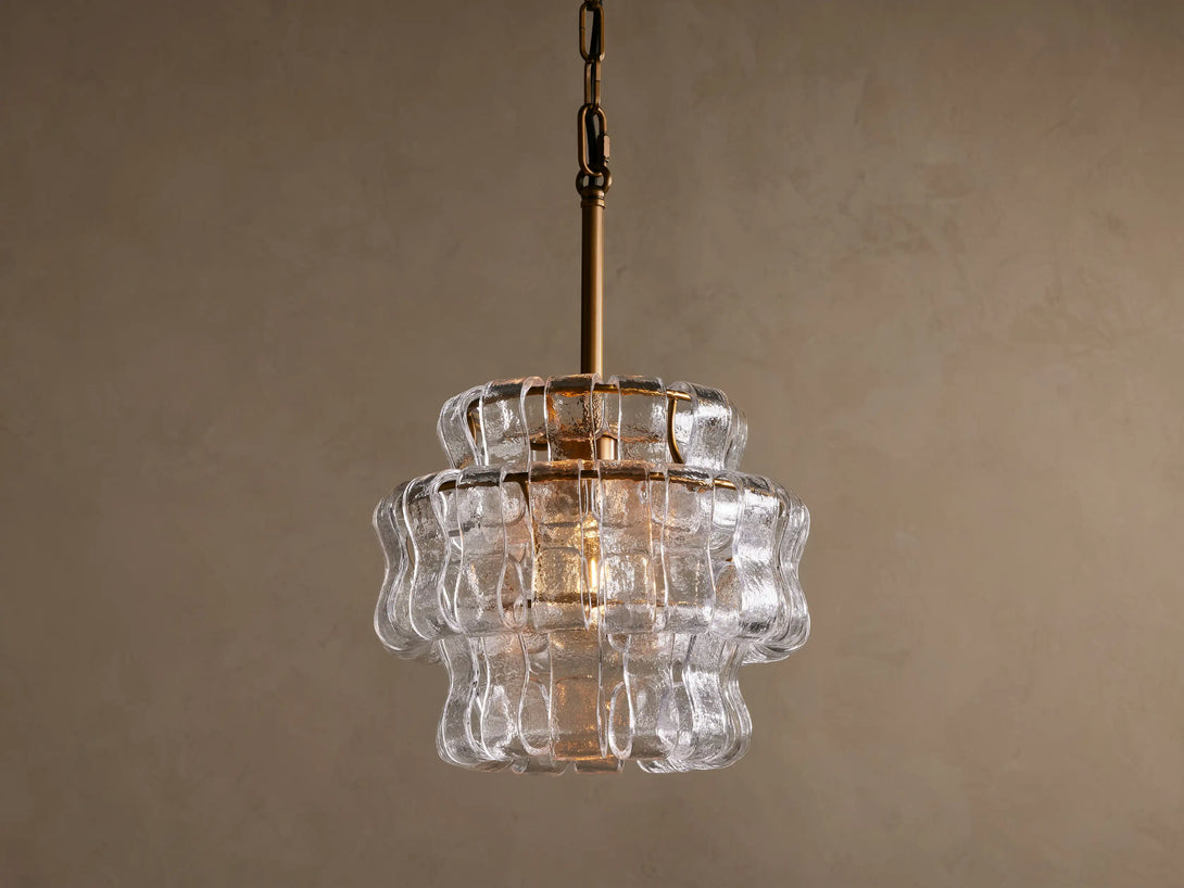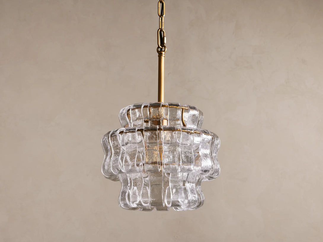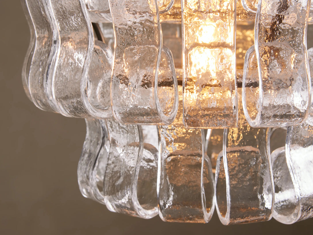Inspired by the famous Italian decorative glass, the Amor chandelier artfully diffuses light through curved textured glass pieces. It features an electroplated brass finish to elegantly illuminate any room.