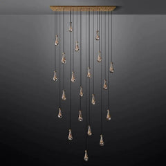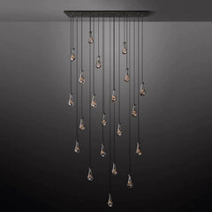 Much like the rhythm of a rainstorm itself. Suspended from slim black cords, drops of blown glass encase the bulbs – creating the illusion of underwater illumination – and cast luminous ripples that wash across ceilings and walls.