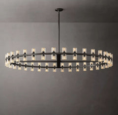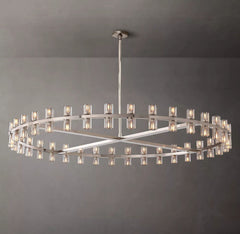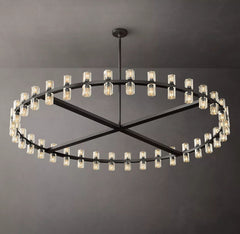 The collection is inspired by the shape and scale of industrial gears, where spokes intersperse with negative space in order to interlock with other gears. Here, the spokes are hexagonal forms juxtaposed with rounded interiors, beautifully crafted of crystal glass, running along a simple, solid metal frame.