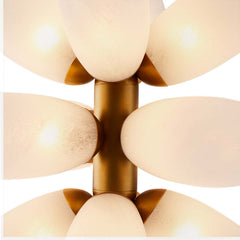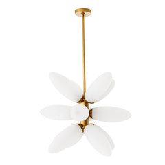 This chandelier offers a modern interpretation of the classic Sputnik design, featuring a bundle of elongated, frosted glass petals. It emits a warm, inviting glow, making it ideal for adding a touch of playful elegance to any room. This piece is certain to generate interest, blending modern aesthetics with a touch of whimsical charm. This unique and captivating fixture will illuminate your space.