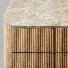 Crafted by the renowned design duo Aurelian Bina and Ronald Sasson, the Aurelian Open Nightstand exemplifies elegance and innovative design. Defined by its unique wire-brushed solid American oak reeds, this table stands out with its sophisticated texture and organic appeal. The design is softened by radius corners that curve around the sides, creating a fluid, uninterrupted silhouette that commands attention.