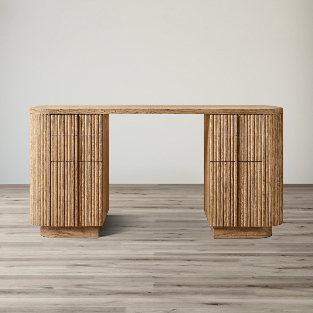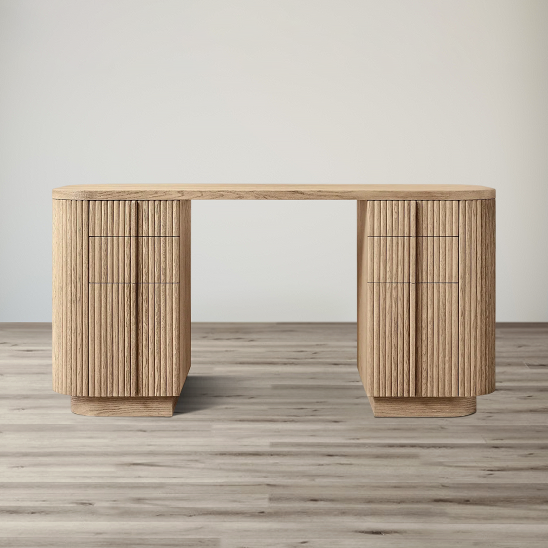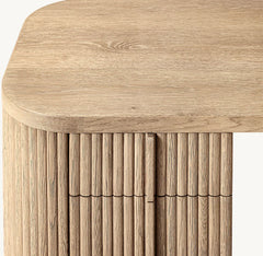 Defined by individually applied reeds of wire-brushed solid American oak. The collection features radius corners that curve around the side for an uninterrupted, fluid silhouette.
