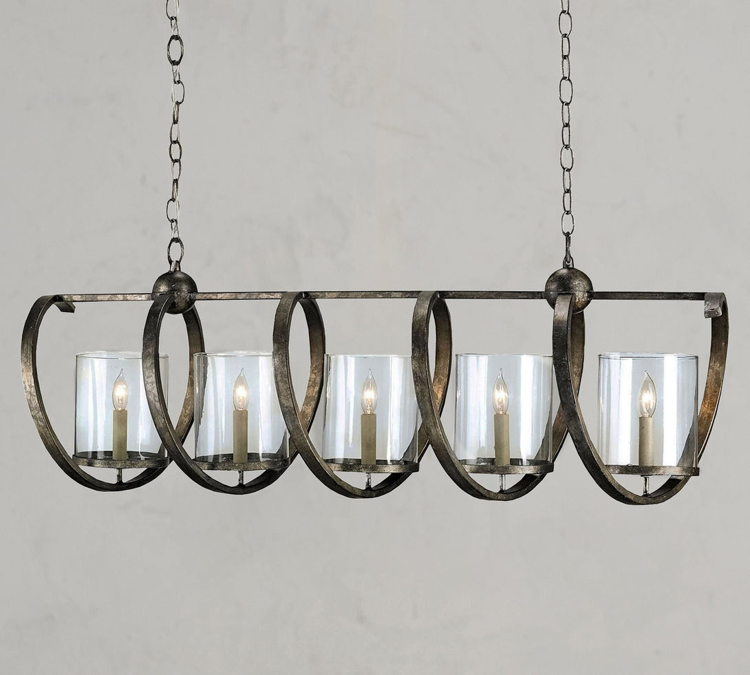 - Crafted of wrought iron with recycled, clear glass shades.