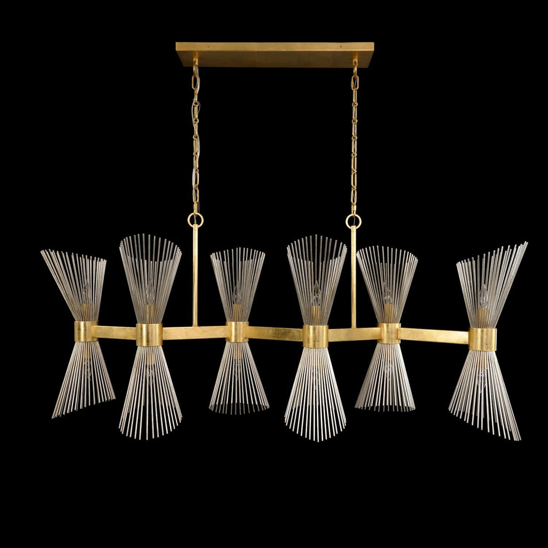 The Bonheur Twelve-Light Horizontal Chandelier is a lively statement piece featuring staggered, slant-cut rod shades in silver leaf, forming a dynamic conical silhouette. An antique gold-leaf frame contrasts beautifully with the silver finish, creating a sophisticated interplay of light and texture. With an adjustable dimmer, this chandelier offers both elegance and versatility, making it ideal for modern interiors.