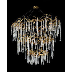 An organic statement piece, this three-tiered twenty-light chandelier features sculptural brass branches adorned with handblown glass teardrops. The cascading tiers create a dramatic interplay of light and texture, making it an extraordinary focal point for grand interiors.