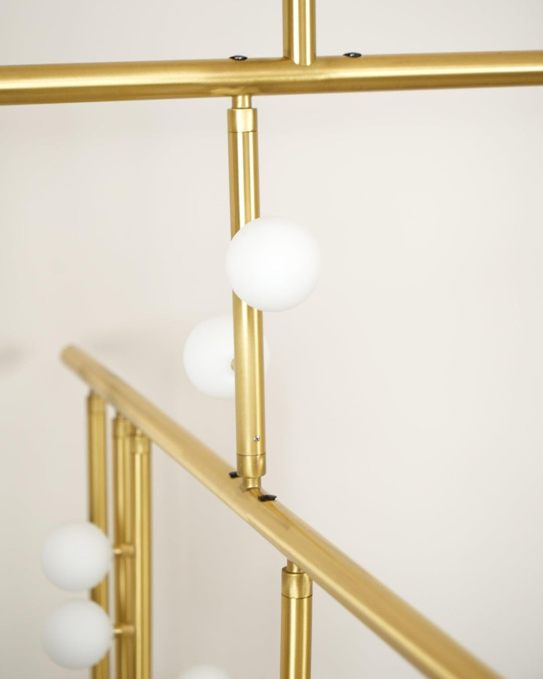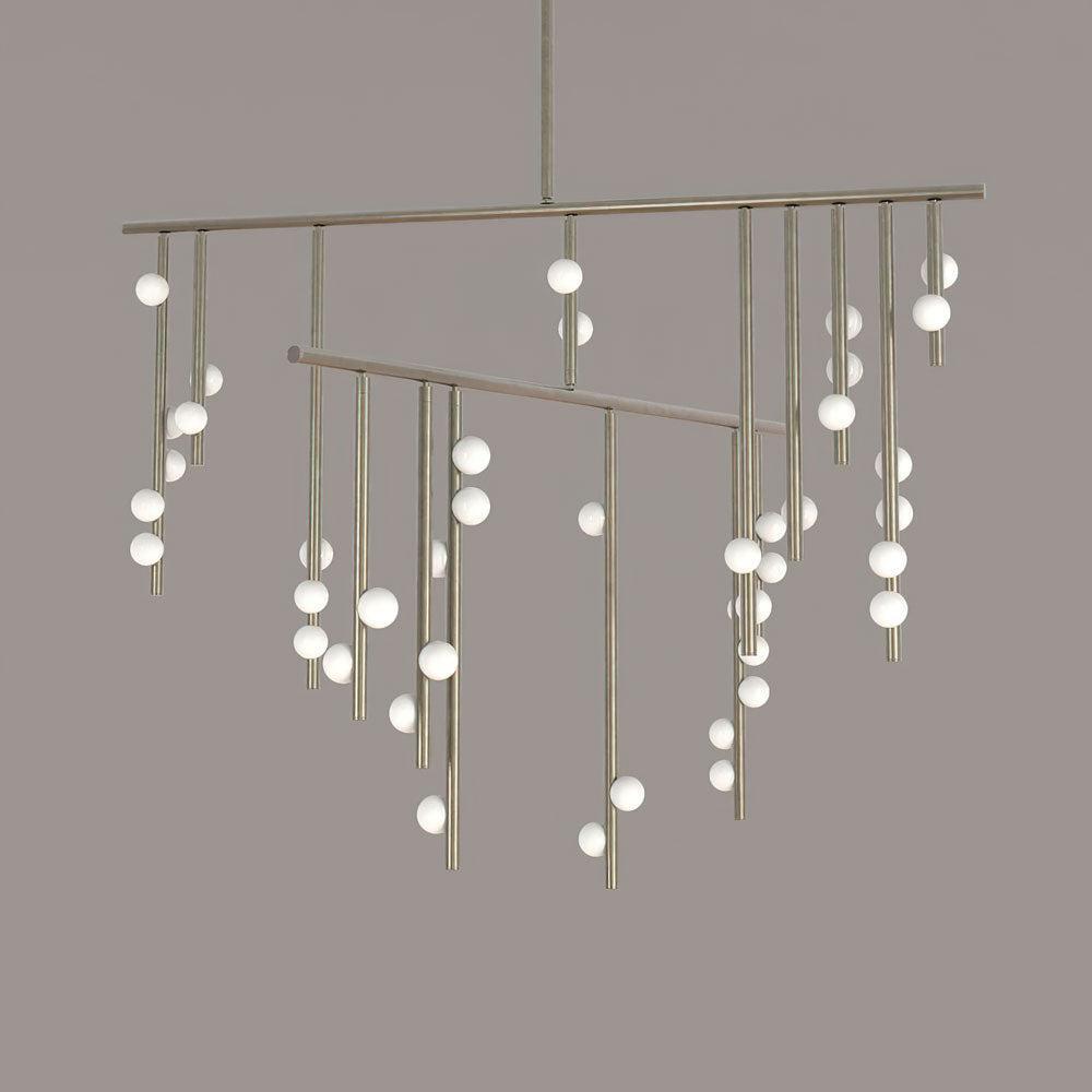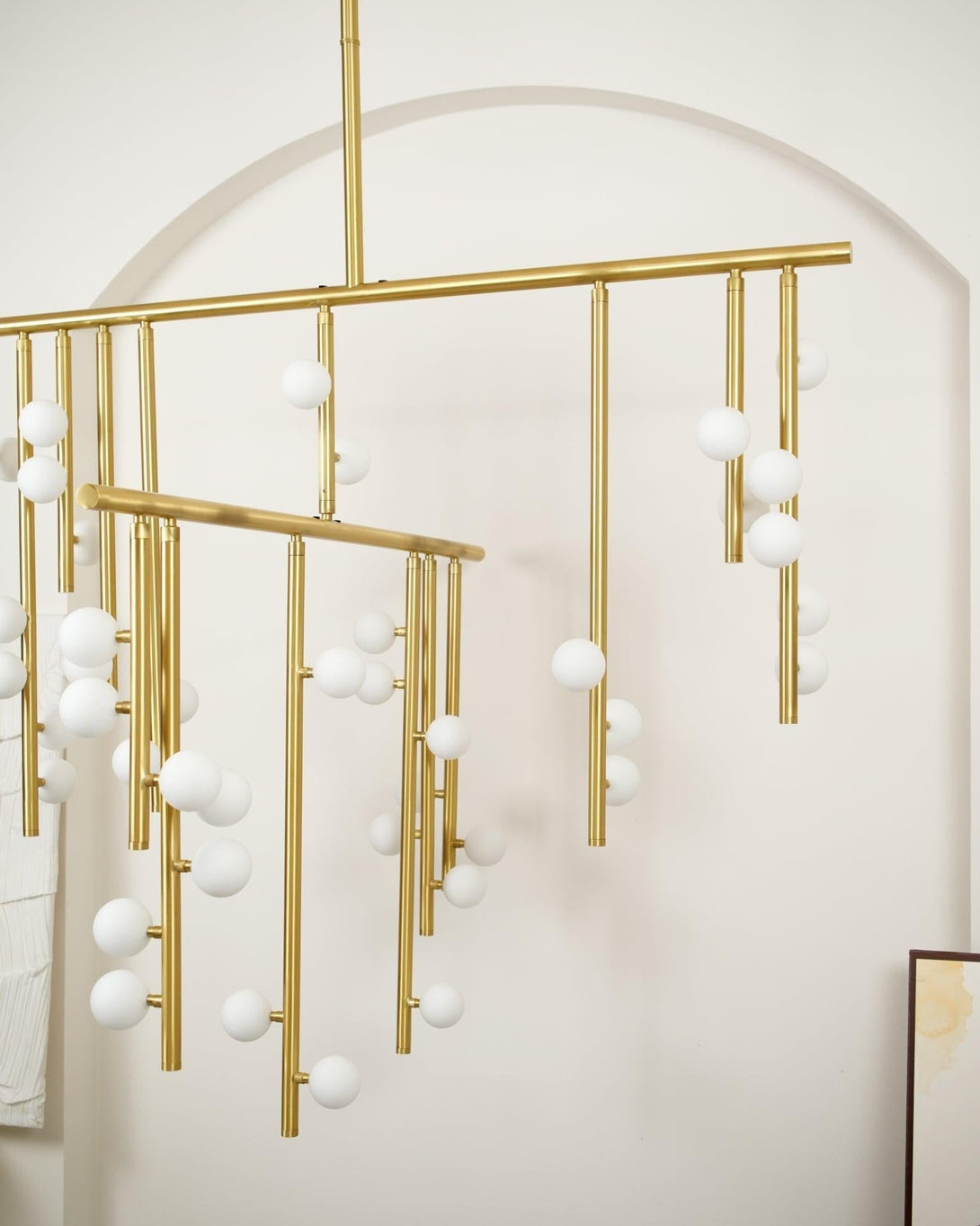 Brass Glass Drop Chandelier is an elegant fusion of form and function, featuring flexible joints that allow its slender rods to gracefully tilt, capturing the essence of organic movement. Adorned with delicate blown glass orbs reminiscent of pearls, and available in finishes like brushed brass and tarnished nickel, this chandelier brings a touch of natural sophistication to any space.