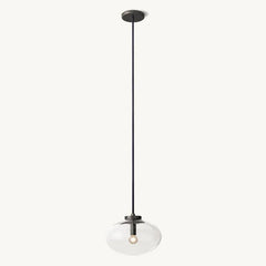Handblown oval glass shades seem to float overhead in the Cabretti collection. Held by an industrial metal frame, the globes are suspended from black cords, marrying clean geometry with understated elegance.