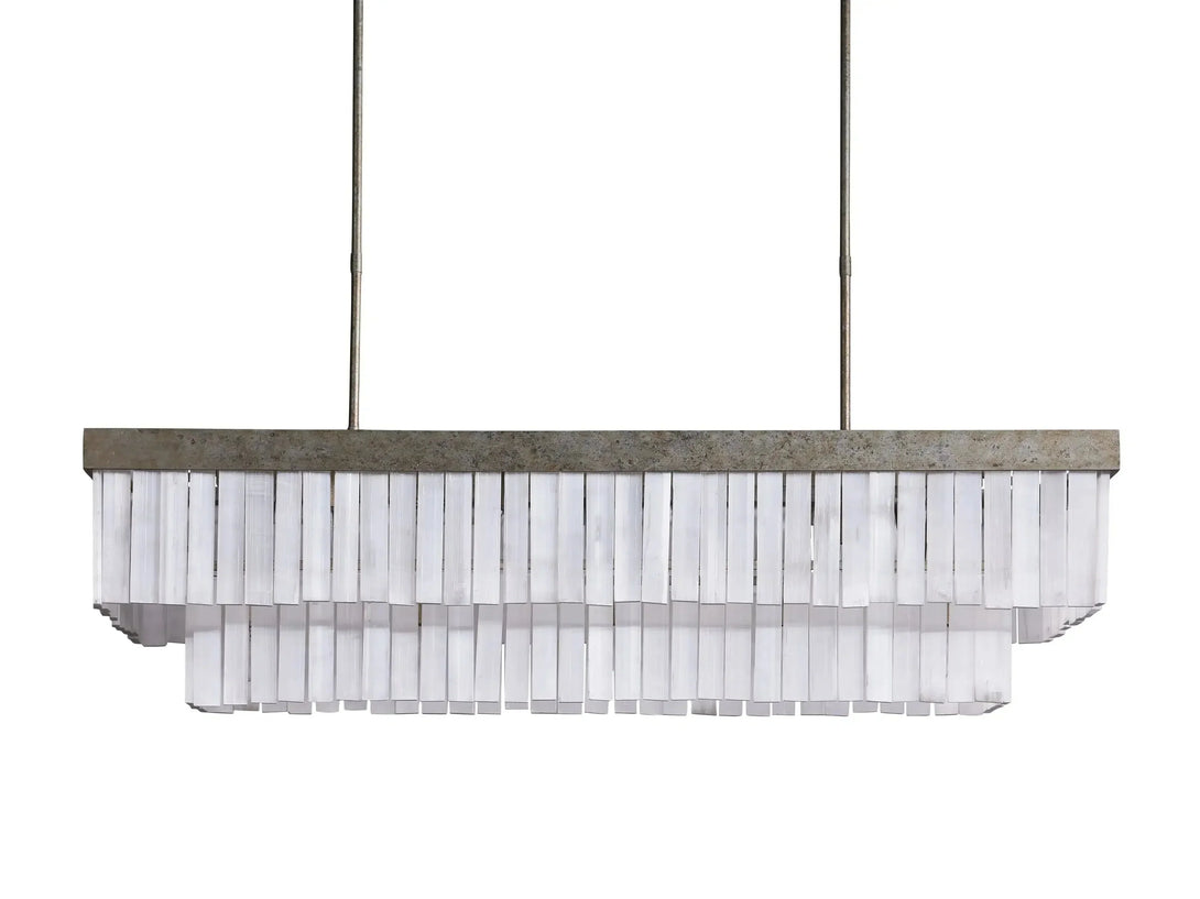 - Adorned with natural selenite crystals, our Cameron Lighting Collection reflects light as they hang elegantly beneath the iron frame. An antiqued silver finish is hand-brushed by our artisans, creating a glamorous aesthetic.