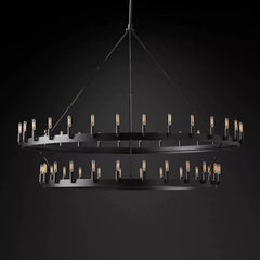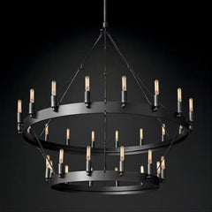 | Rustic in style, simple in form and grandly sized, the chandelier Drawing inspiration from early 20th century industrial fixtures, it's built of stout angle iron. |