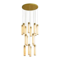 The Celestial Alabaster Cascade Chandelier is a symphony of light, form, and exquisite materials, designed to add an air of sophistication to any space. This chandelier features an array of cylindrical alabaster shades suspended at varying heights, each emitting a soft, natural glow that highlights the unique veining and translucent quality of the stone. The chandelier's sleek lines and the cascading arrangement create a sense of movement and elegance, making it a captivating centerpiece for grand foyers, dining rooms, or high-ceilinged lounges.