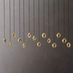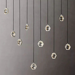 The collection features lighted crystal orbs, suspended in hexagonal fittings within a flat metal frame. The design was inspired by plans for the cenotaph of Sir Isaac Newton drawn by 18th-century architect Etienne Louis Boullée, a visionary ode to physics reinterpreted in a stunning contemporary form.