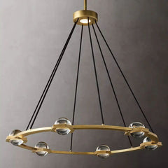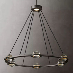 The collection features lighted crystal orbs, suspended in hexagonal fittings within a flat metal frame. The design was inspired by plans for the cenotaph of Sir Isaac Newton drawn by 18th-century architect Etienne Louis Boullée, a visionary ode to physics reinterpreted in a stunning contemporary form.