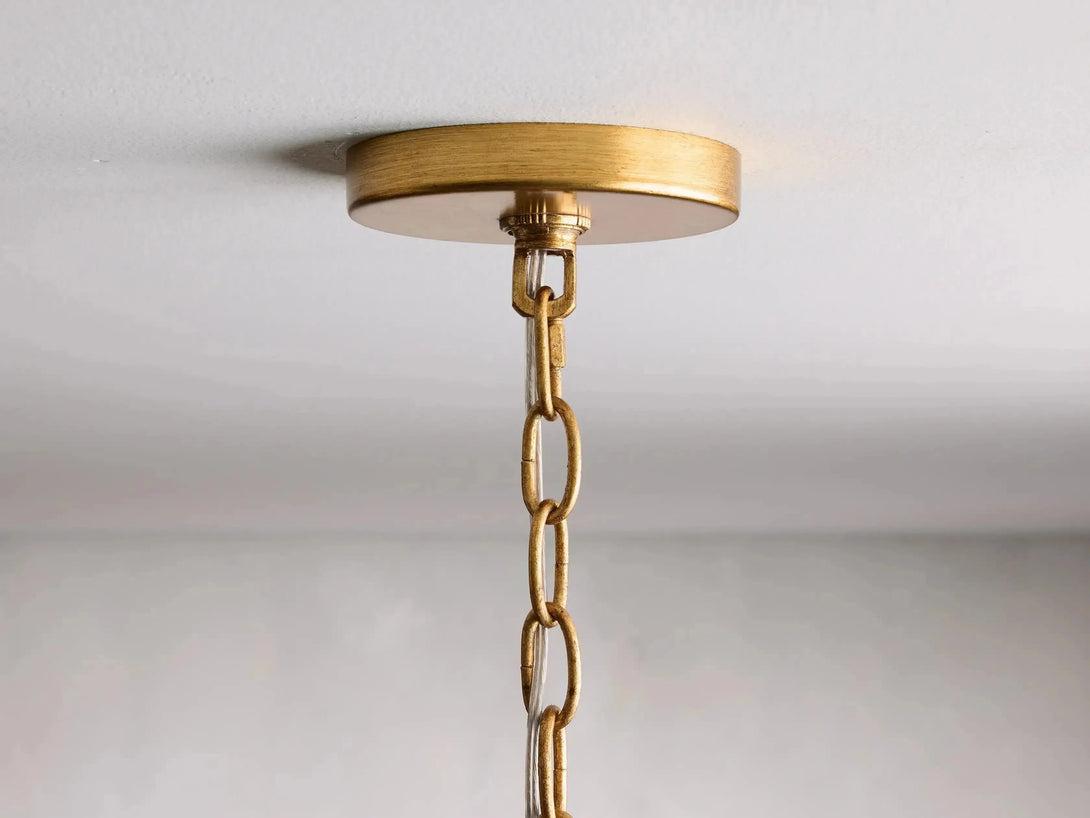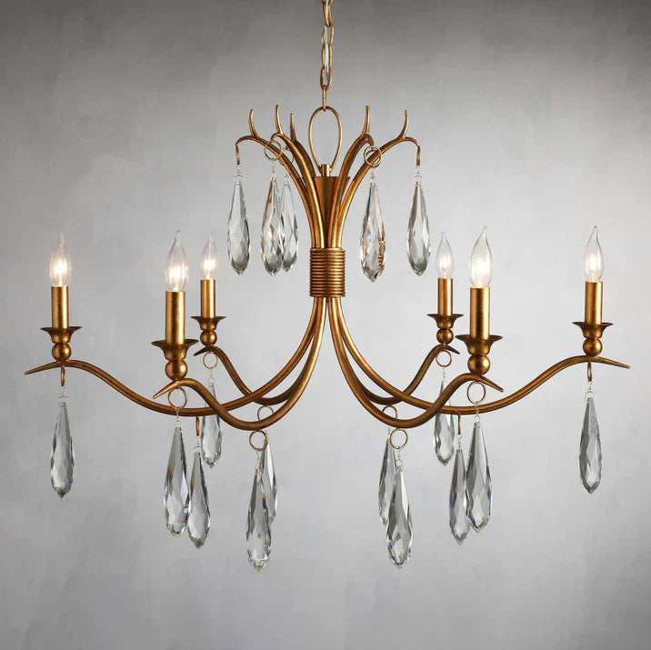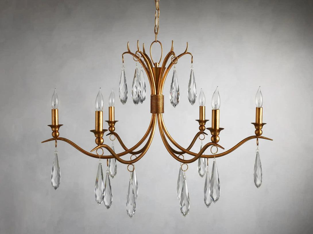 - Our stunning Celine Chandelier is adorned with 18 crystal drops that shimmer when illuminated. Its grand scale and warm, gold leaf finish make Celine a focal point in any home.