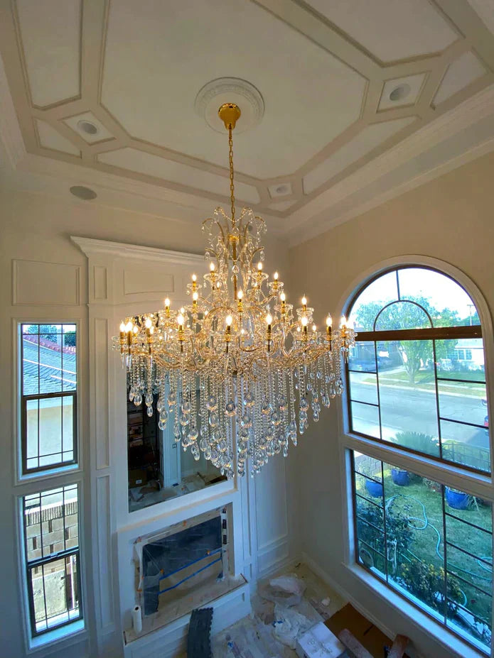This 44-Light Candle Light Crystal Chandelier features a Gold finish and hundreds of crystal drops that sparkle to create a sophisticated atmosphere. Each arm is wrapped in glass and the chandelier is made from durable crystal, making it ideal for vaulted or sloped ceilings. This Classic Modern Multi-layers Crystal Chandelier is perfect for adding a touch of luxury to staircase, foyer, or villa.