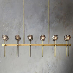 The collection crafted of solid brass and crystal glass, for luxe materials and superior craftsmanship, each finely faceted sphere is ground and polished by hand to reflect and refract the light.