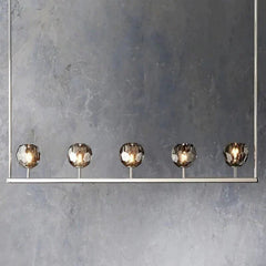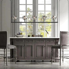 The collection crafted of solid brass and crystal glass, for luxe materials and superior craftsmanship, each finely faceted sphere is ground and polished by hand to reflect and refract the light.