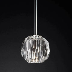The collection crafted of solid brass and crystal glass, for luxe materials and superior craftsmanship, each finely faceted sphere is ground and polished by hand to reflect and refract the light.