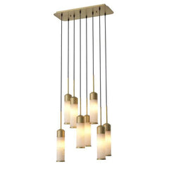 The 8-light cluster Chandelier Eos will make any private or public space more interesting and attrdraft. This sophisticated hanging pendant is just perfect to create a warm and pleasant atmosphere in living areas. restaurants. and hotel lobbies. A contemporary design of sculptural tubes and straight lines. each alabaster shade is capped with antique brass metalwork. The cables can be adjusted to vary the depth of fall. positioned over a centre table or as a focal point elsewhere in the space