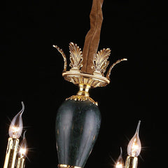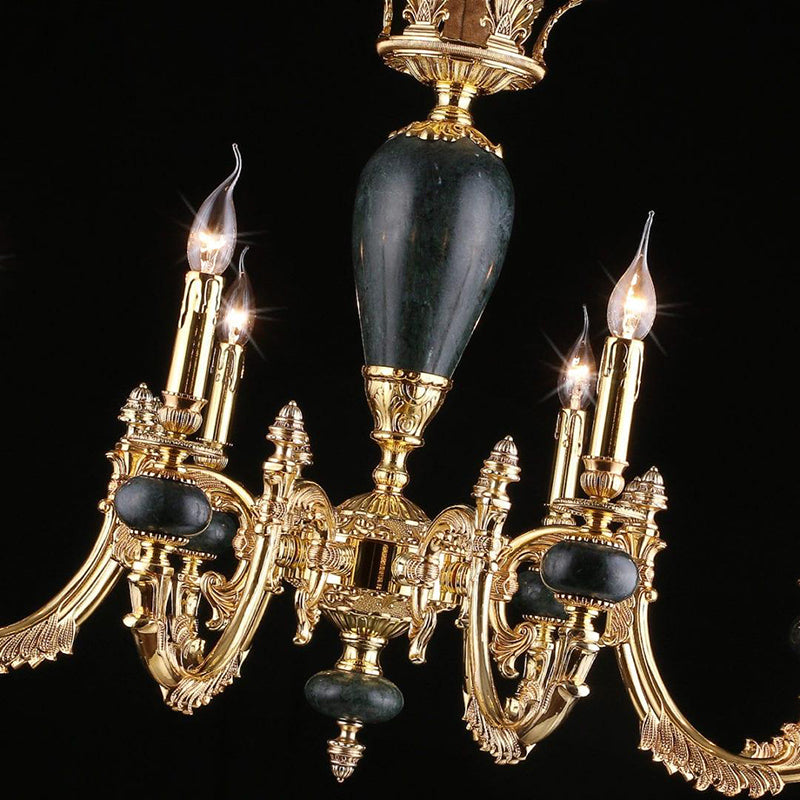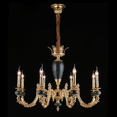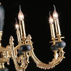 A chandelier with pure sparkle and graceful traditional form. This design is alive with glittering clear crystal. The fluid arrangement hangs from a gleaming bronze finish frame which amplifies the shine. The copper lamp arm is made by electroplating process and sand-casting process. The lines are beautiful and smooth, and the carving is exquisite. The natural black gold and jade stone is used to create the lamp column. The surface smooth and reflects the beauty of nature. The clear K9 crystal sparkles under the light with unique candle light design, extremely beautiful.