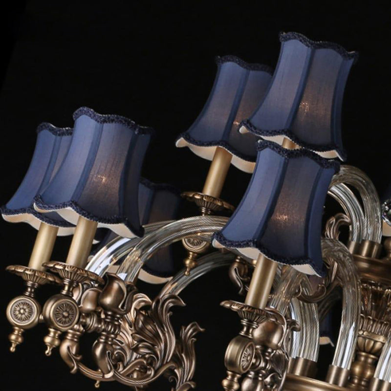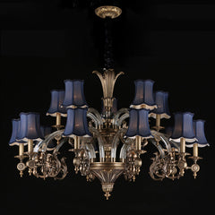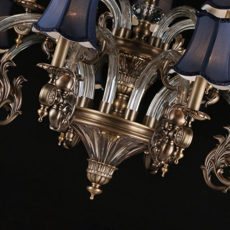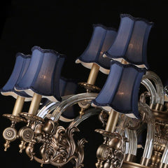 This collection is European style classical and elegant chandelier made of copper, glass and textile. The lamp body is made of dark-bronze copper. Produced through many exquisite handcraft procedures such as sand casting, and carved through exquisite skills, it is firm, stable, anti-rust, anti-corrosion, anti-scratch and non-fading. The blended glass tube of the lamp arm, transparent and shining, is stable and firm in structure with fluent and nice edge lines, showing luxury and magnificent vibe. When reflected by the light, the glass tube shows a three-dimension visual effect. The textile lampshade colored with royal blue is exquisitely made by hand, providing a mysterious and graceful vibe and showing the art of color matching. The light penetrating it is gentle and natural.