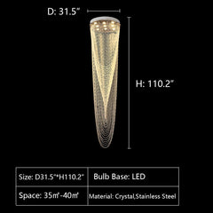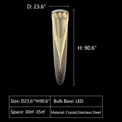 The body of this chandelier is made of stainless steel and high quality K9 crystal material.It is designed into a luxurious atmosphere style. And its shape is full of creativity and novelty, combined by a string of crystal beads, the inner circle around a circular stainless steel chassis to form an inverted cone, and then around a circle of crystal chains outside, like a waterfall, forming a breathtaking array of light.Perfect for Spiral Staircase,Hotel Lobby,Loft,Villa,ect.