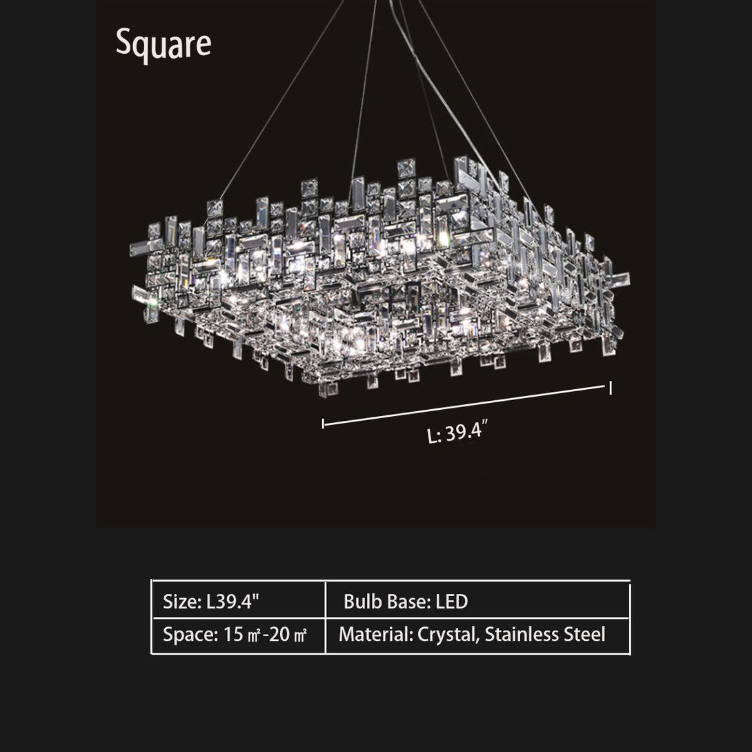 Combining the elegance of traditional rectangle and square design with the sleekness of a post-modern fixture, this chandelier suit is a collection of numrous little crystal blocks, which are all irregularly together in chrome finish. Inclined form grants the chandelier cool modern sense and ethereal feelings. The square style is suitable for dining room and bedroom. The rectangle style is compatible with large living room, kitchen island or bar. Collocation of the two is a fine match.