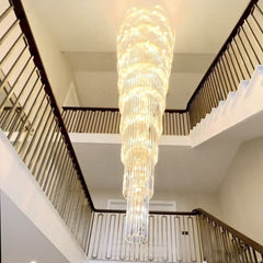 This large ceiling light length chandelier is made of high quality crystal and stainless steel. Multi-faceted cut crystals have surface of the cutting edges and corners, bright and dazzling. Simple design with exquisite structure are in sound harmony with any large space. This light decorates duplexes, two-story, large houses staircase,big foyer,hallway ,entryway.