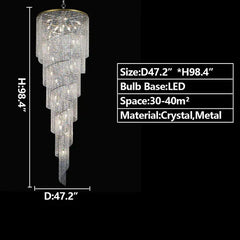 This Extra Large Spiral Tiered Long Crystal Chandelier Luxury Crystal Tassel Light Fixture is the perfect way to make a grand statement in any staircase or entryway. Featuring high-quality crystal and two tiers of silver crystal, it will bring a touch of luxury to hotels, restaurants, bars, and boutiques.