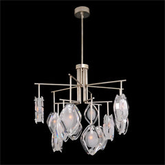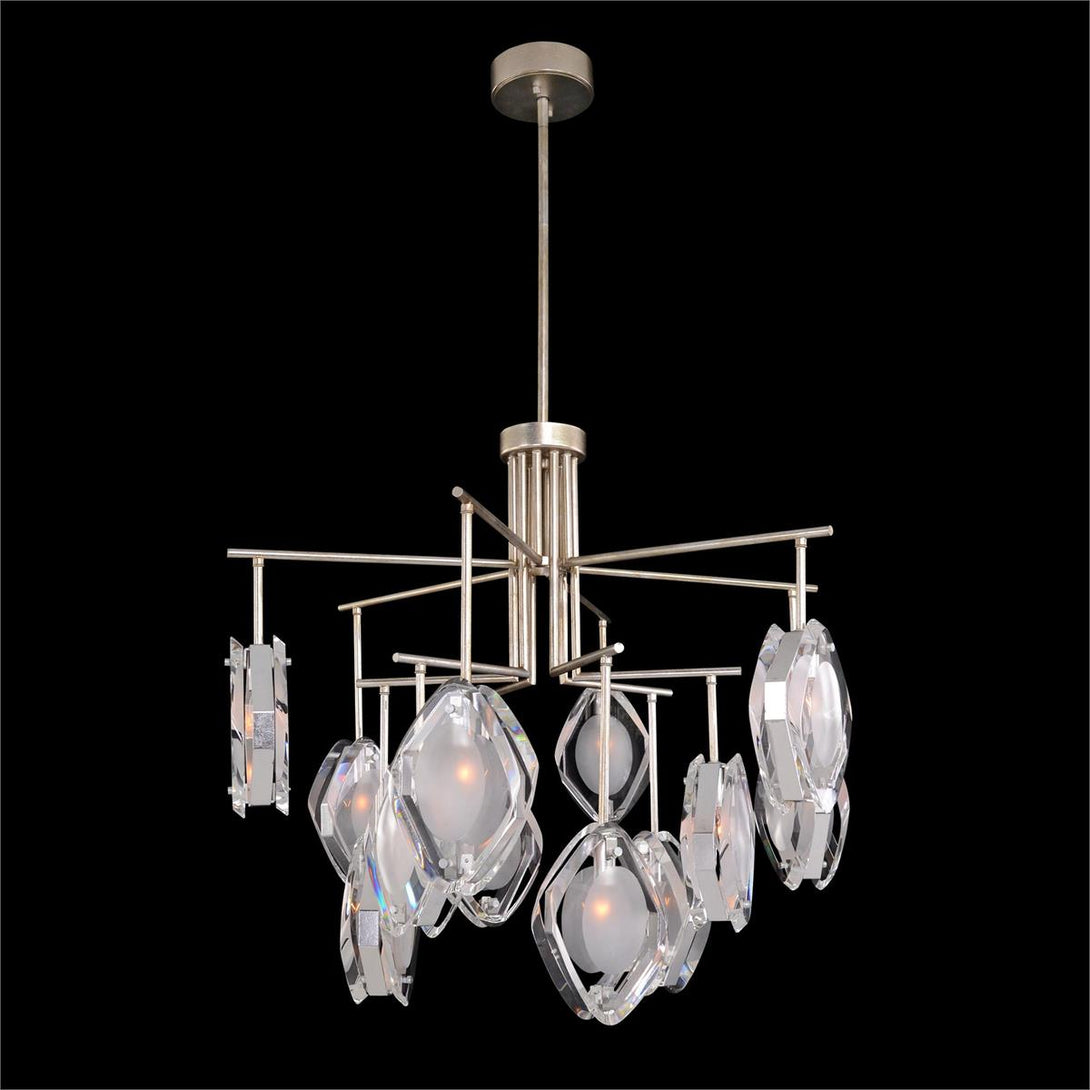 A graceful twelve-light chandelier in an antique silver finish. Clear and etched glass combined with faceted crystals refract the light, creating a shimmering prismatic display that elevates any space.