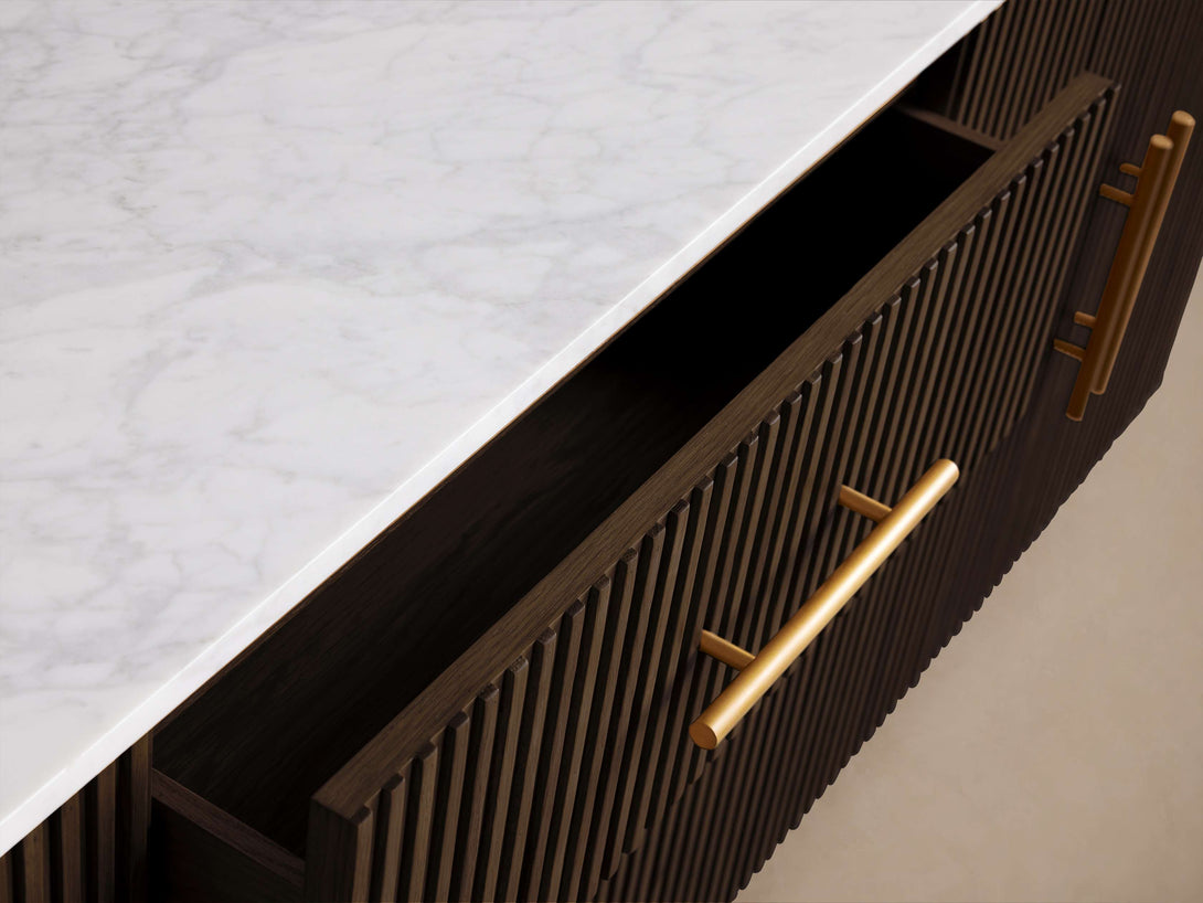 - Zinc-alloy hardware and plinth base feature a brass finish.