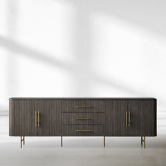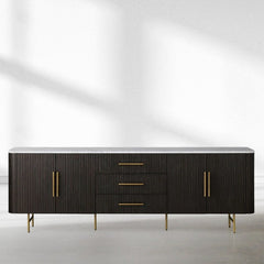 - Drawer Material: Solid wood drawers with zinc-alloy finger pull hardware in a light brass finish.