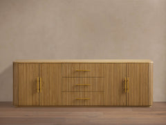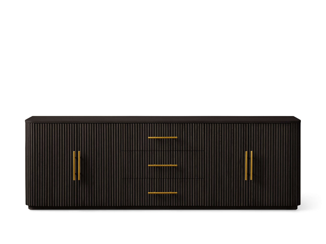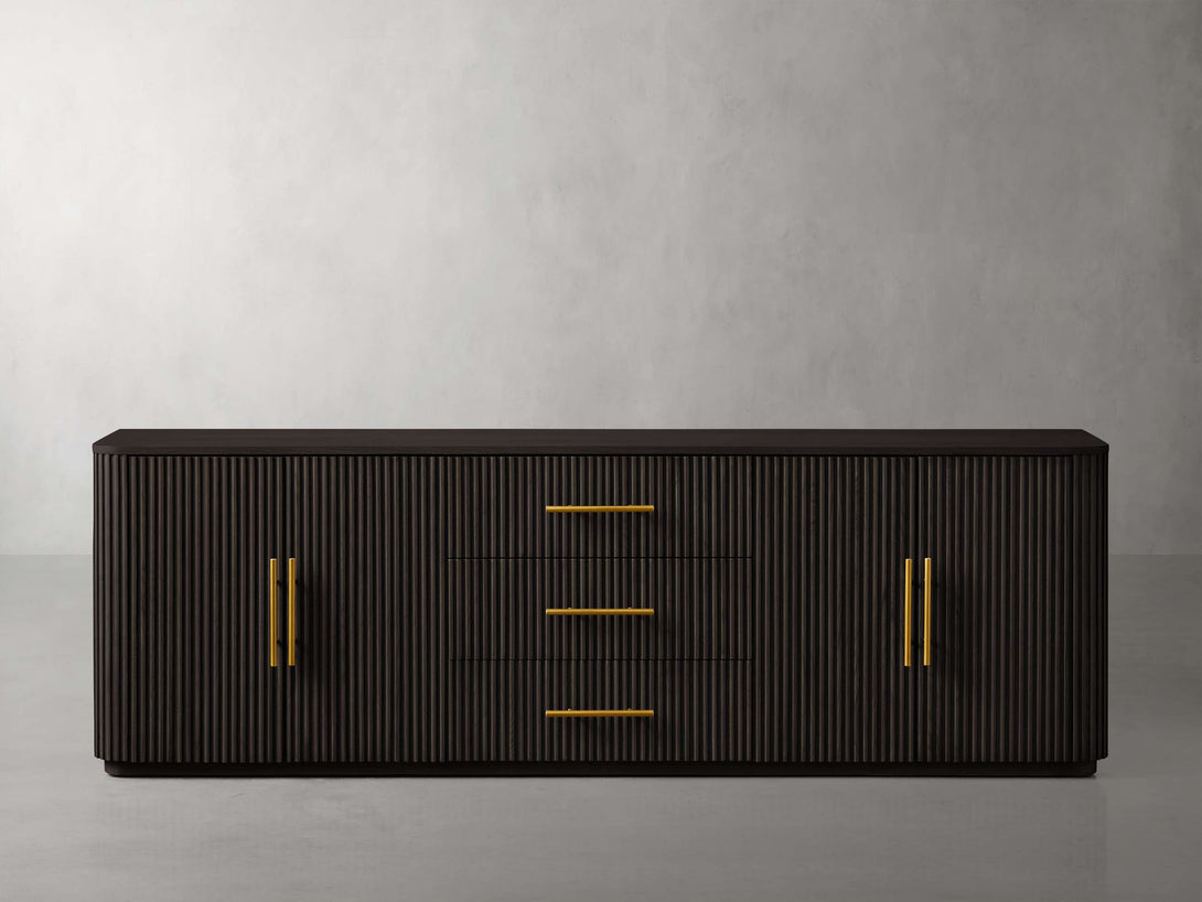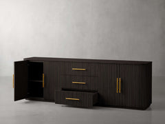 - Includes two doors on either side with three drawers in the center and cord management to accommodate electronics.