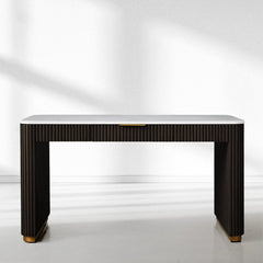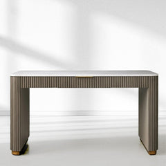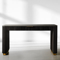 - Drawer Material: Solid wood drawers with zinc-alloy finger pull hardware in a light brass finish.