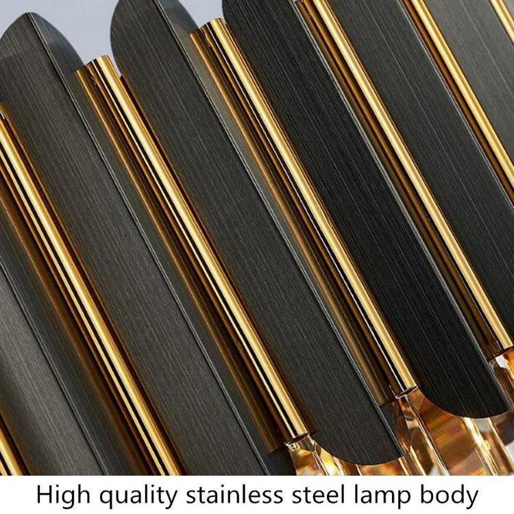 This incredible piece commands the attention of everyone who enters the room. A truly stylish modern crystal chandelier that fits perfectly in any space in your home. The color of the frame is very similar to gunmetal gray with gold inlay trim detail between the strips. |