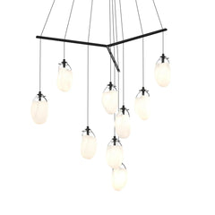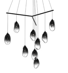 The surface contours of this meteor like glass volume have the softened look of melting glass. The visual weight of this amorphous sculpture is glorified by the thinness of the cable from which it hangs and the single point source of LED illumination within its contoured volume.