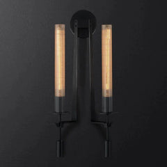 Made of solid brass, the collection's minimalist construction features Edison bulbs set in cylindrical ribbed glass that shine like candles.