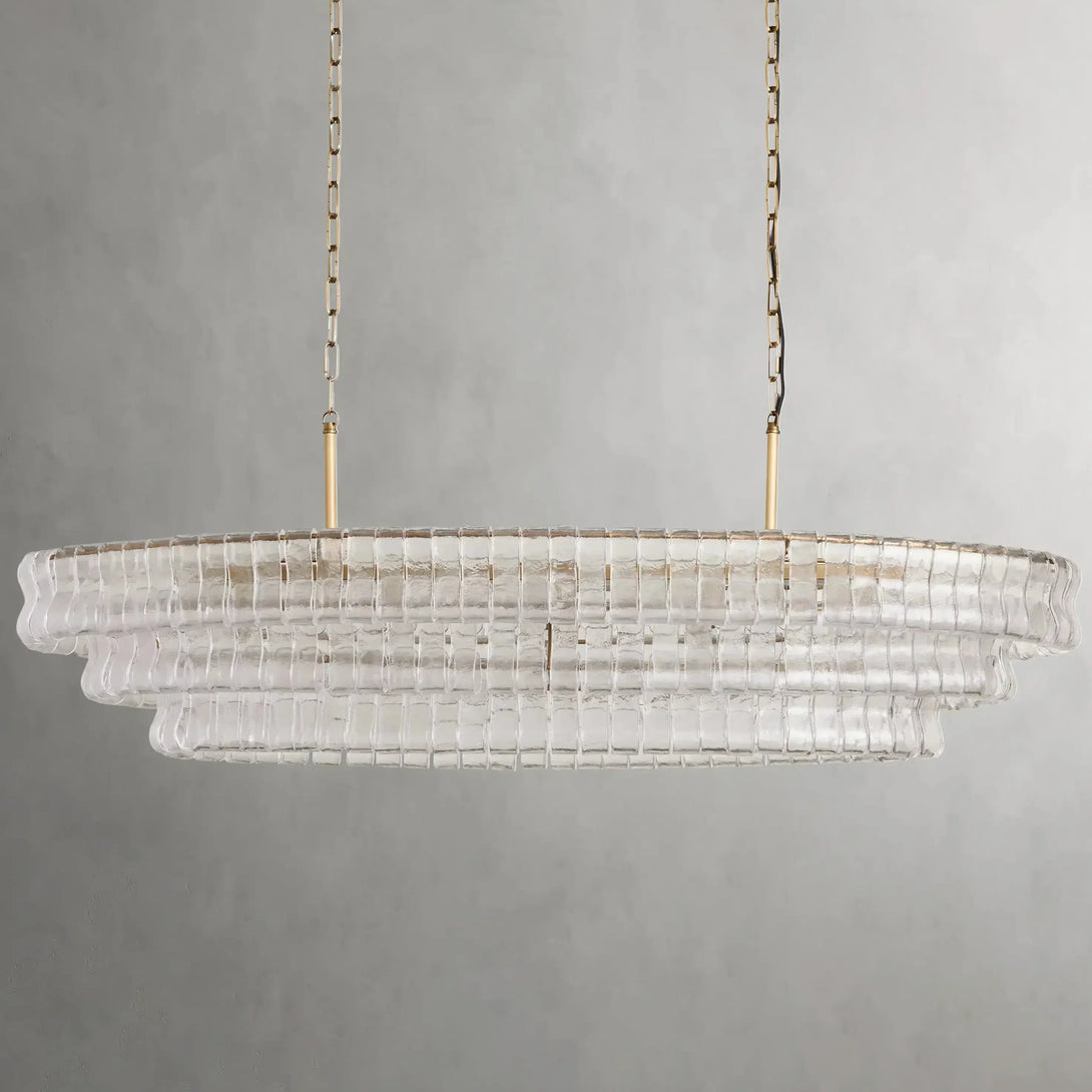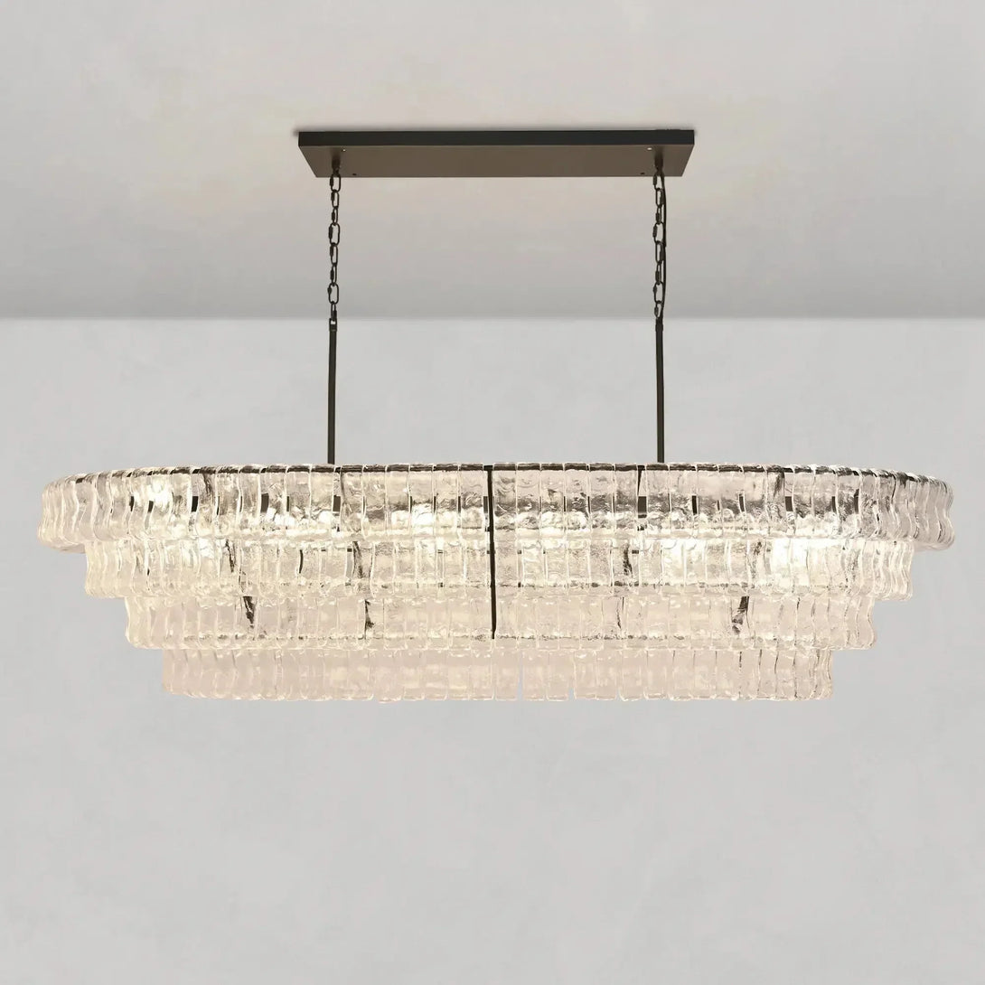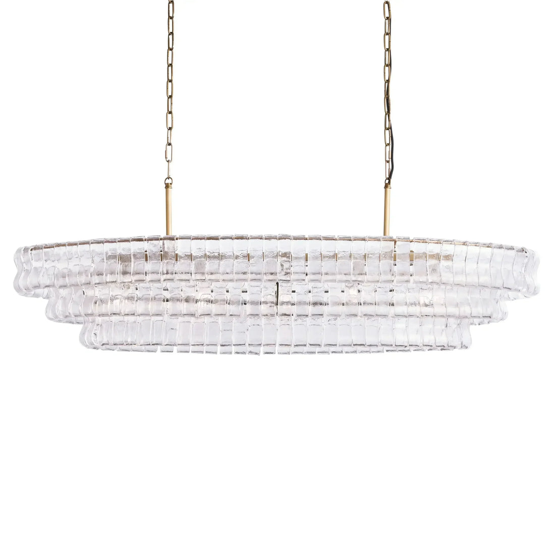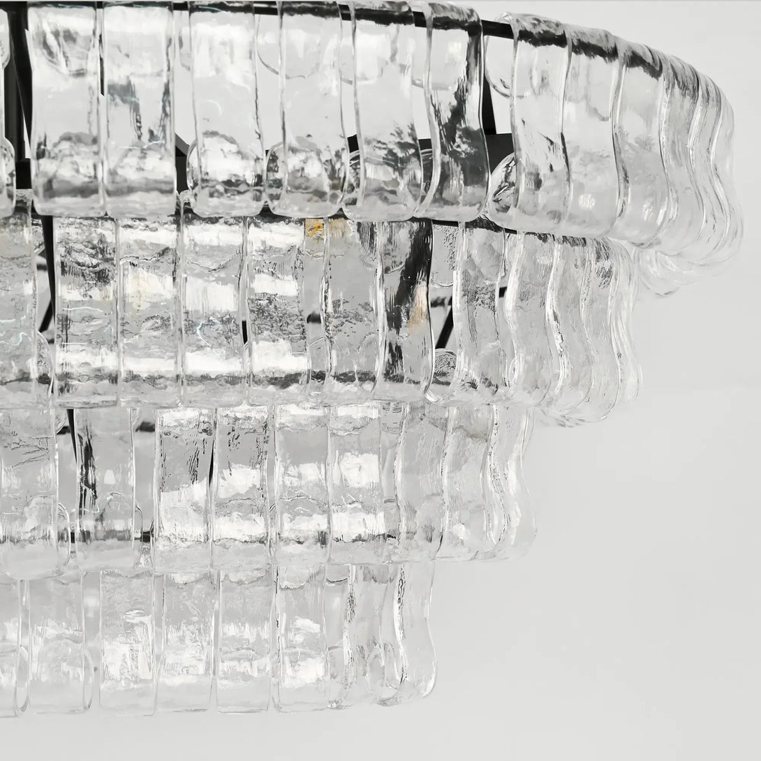- Inspired by famously adorned Italian glass, our Ghiaccio Chandelier artfully diffuses light through pieces of curved, textured glass. Complemented by a plated-brass finish, Ghiaccio elegantly illuminates any room.