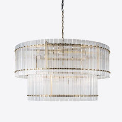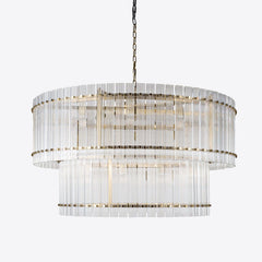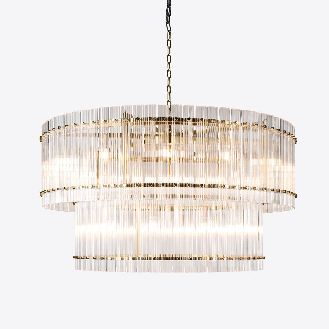 The perfect statement lighting piece, the Grande Double San Francisco features two tiers of ribbed glass panes in a drum formation, secured to a studded brass frame.