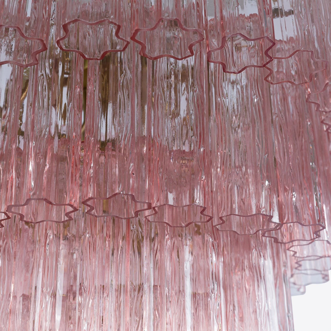 Five tiers of fluted glass tubes create this beautiful mid-century inspired chandelier. The textured glass tubes are individually hung from a Satin Brass frame. This style is available in three colours; a rich, sophisticated Smoked Quartz, a fresh blush Pink or clear glass.