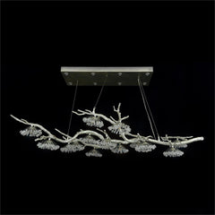 The Hanasaku Oblong Chandelier (from the Japanese word for “flower bloom”) evokes growth and renewal with its organic design. Fourteen lights illuminate sculptural antique silver leaf branches, adorned with hand-cut crystal flower buds clustered in breathtaking detail.