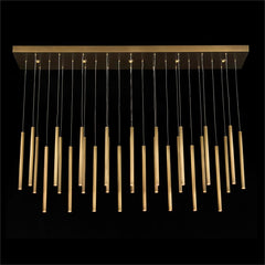 The Hans horizontal, thirty-five-light chandelier features a cascade of illuminated brass droplights.