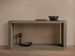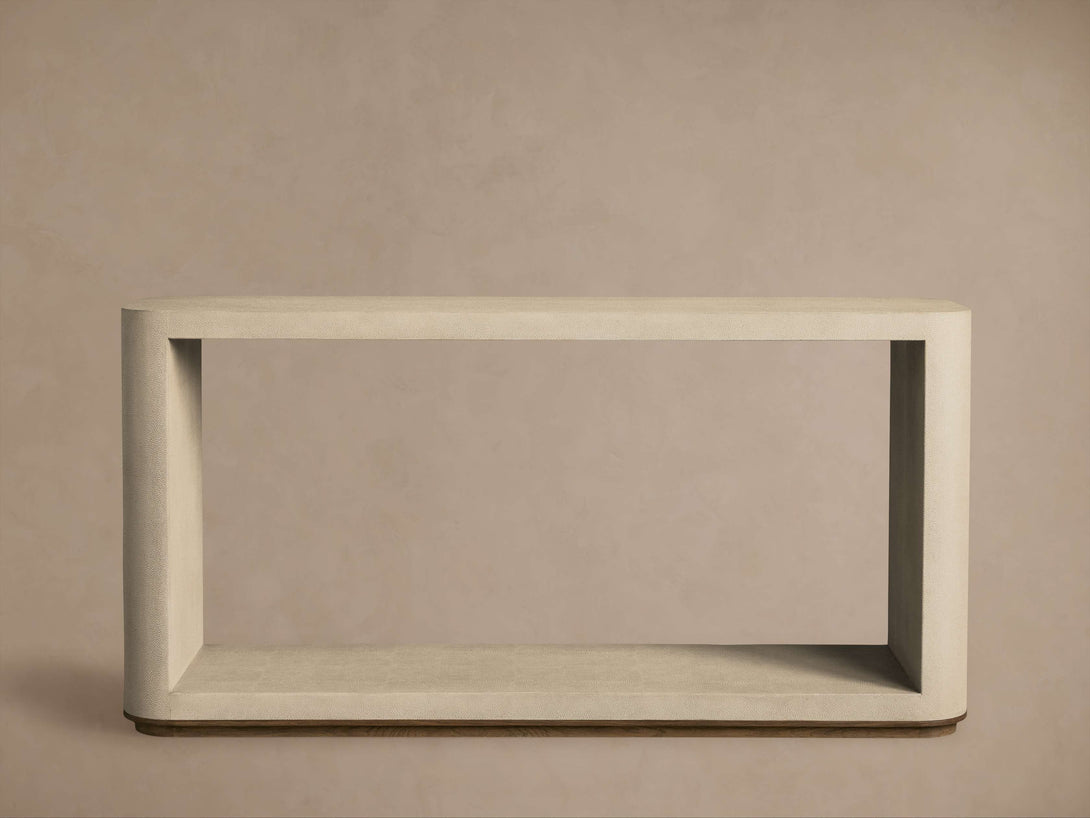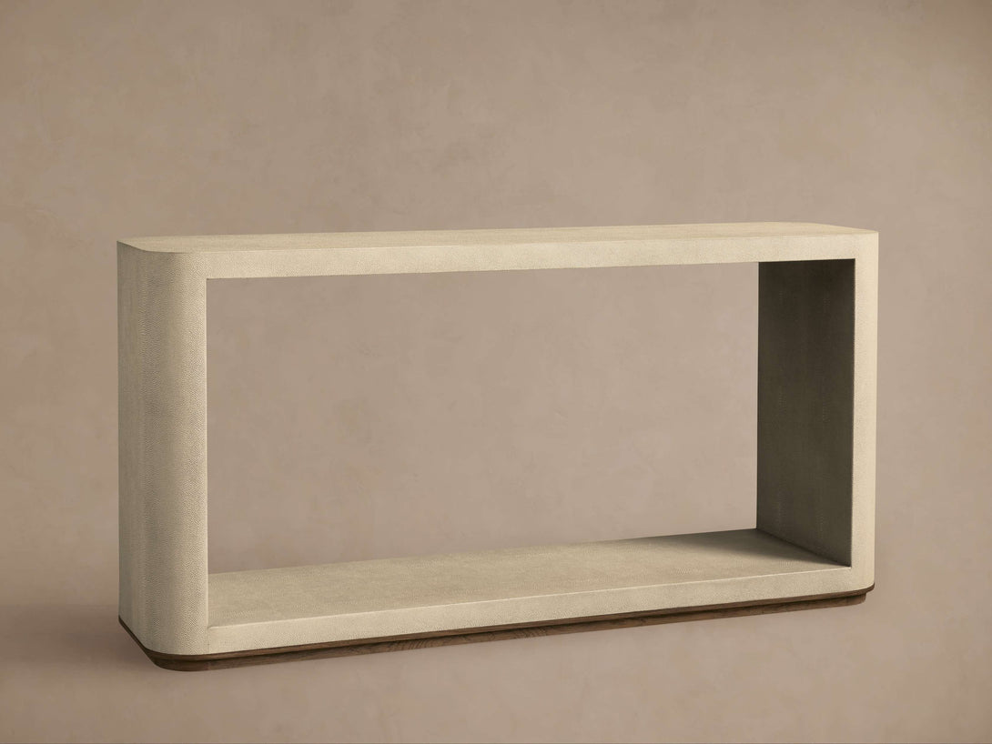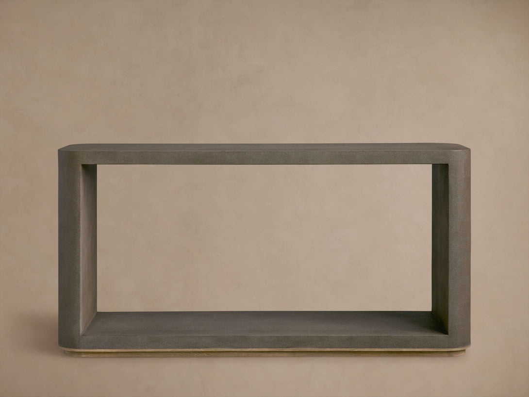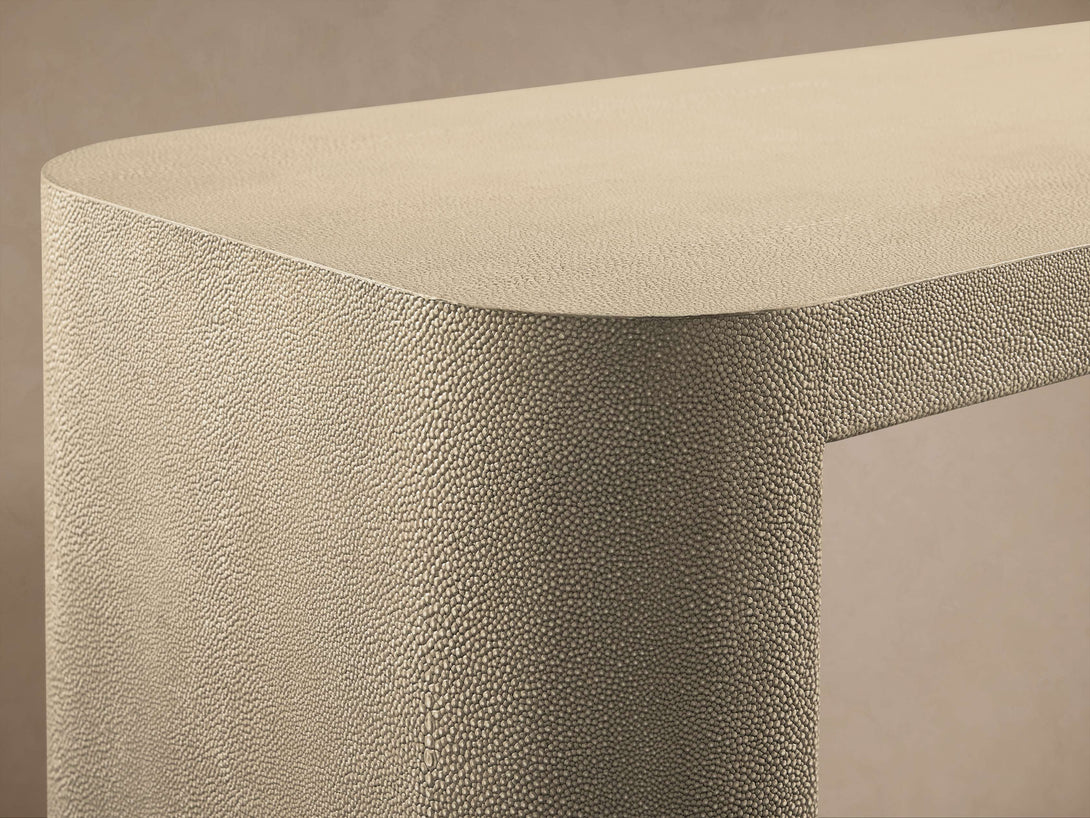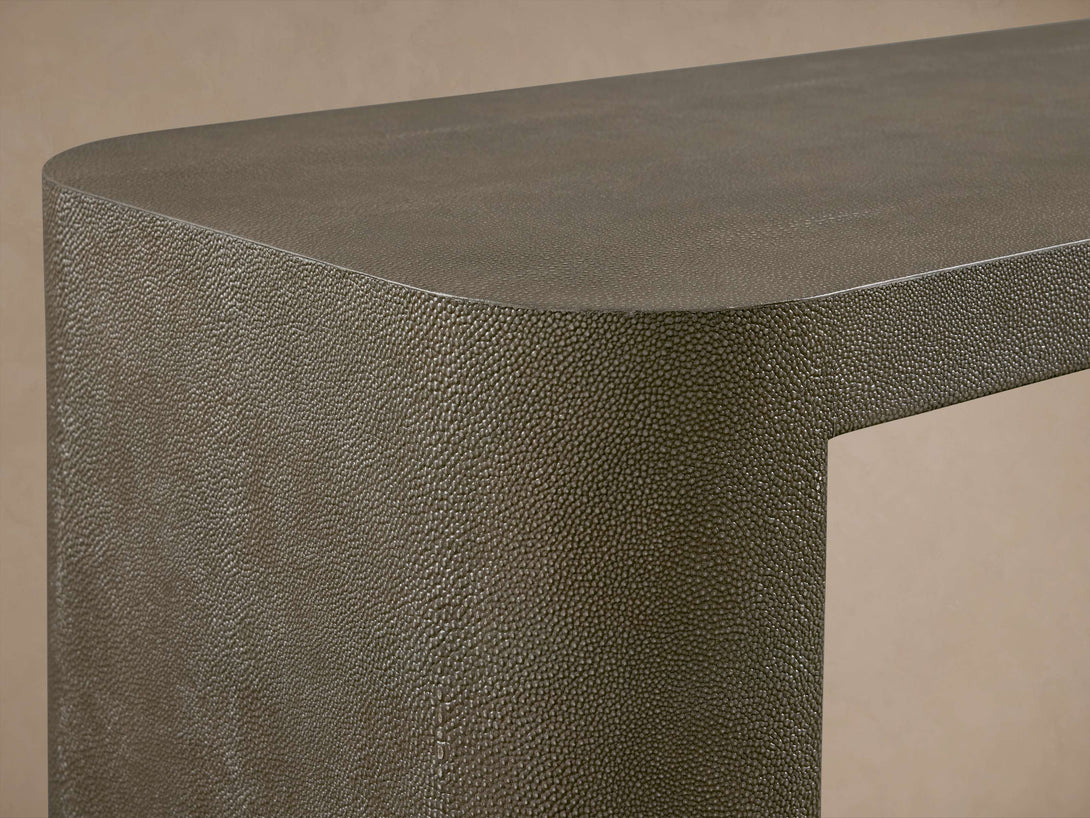 - Tables are crafted from oak hardwood surfaced with reconstituted leather that has been dyed and artfully embossed with a shagreen pattern.