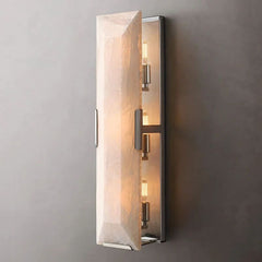 The collection showcases natural beauty with a minimalist sensibility.Translucent alabaster is cut in sheer and faceted slabs, each held in place by a slender mount in our dramatic collection. Warm light shines through the stone, accentuating the play of crystal formations within.
