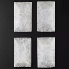 The collection showcases natural beauty with a minimalist sensibility.Translucent alabaster is cut in sheer and faceted slabs, each held in place by a slender mount in our dramatic collection. Warm light shines through the stone, accentuating the play of crystal formations within.